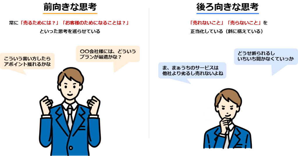営業において「前向きな思考」と「後ろ向きな思考」はどのように違うのか見ていきましょう。