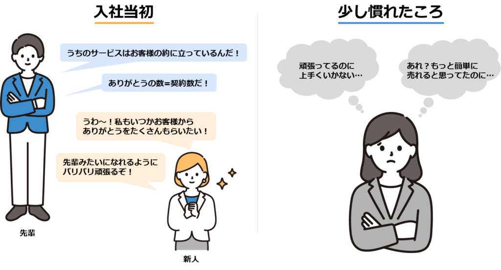 しかし仕事に慣れてくると、「何かを売るのはそんなに甘くない」「不条理なことばかりだ」と思い始め、最初の「営業はいいことだ」「自分たちは役に立っている」という綺麗事の幻想が解けていきます。