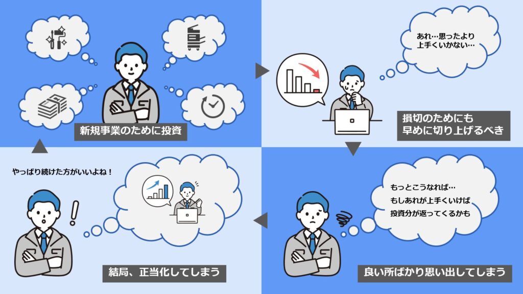 損しないために早くやめておけばダメージは少ないと分かっていても、「ここまでやったしな~」「成功したら投資分回収できるから」など、ここまでやったんだから良いことあるはず!さらにああなったらこんな良いこともある!